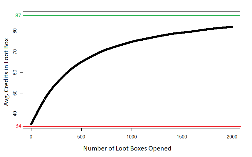 I will assume that Blizzard shifted the drop rates to give players 87 credits per loot box. This is the most extreme scenario. They most likely adjusted the drop rates to give players something between 34 and 87 credits.